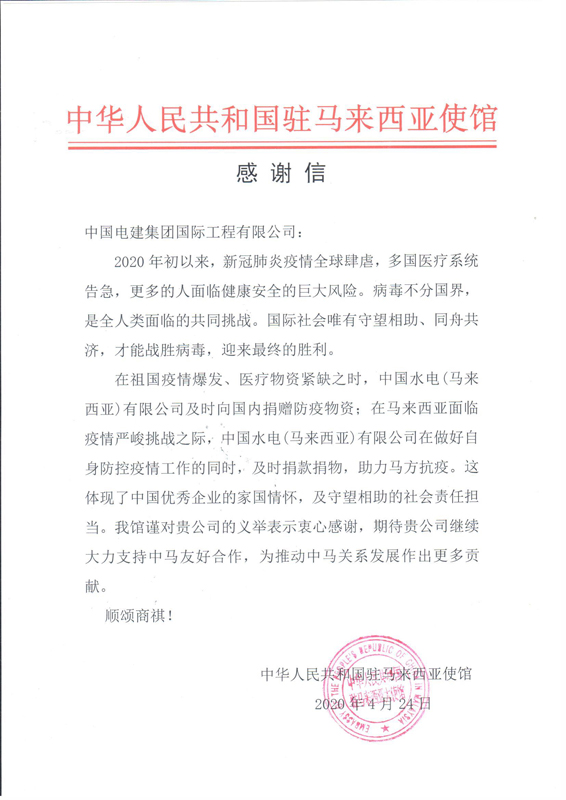 4月24日,中國駐馬來西亞使館向公司發來感謝信,對公司下屬中國水電(馬來西亞)有限公司(以下簡稱馬公司)在祖國疫情暴發、醫療物資緊缺之時及時向國內捐贈物資,在馬來西亞疫情面臨嚴峻挑戰之際,做好自身防控的同時積極捐款捐物助力馬方抗疫給予了高度贊揚。信中寫道:“這體現了中國優秀企業的家國情懷,及守望相助的社會責任擔當。”