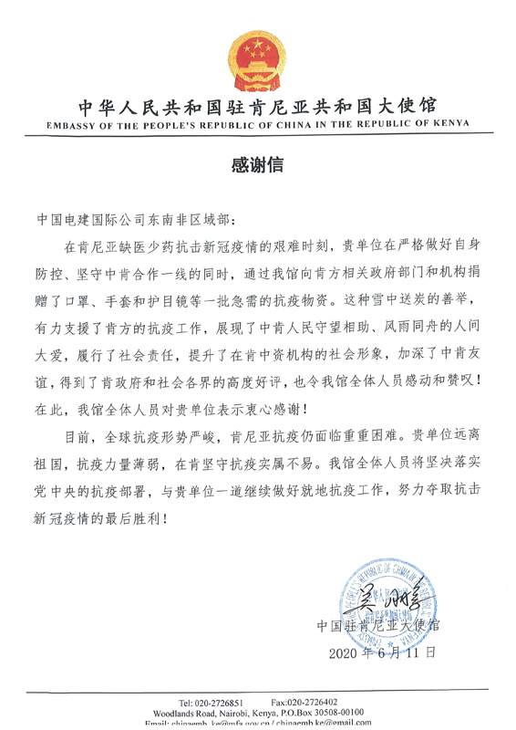 當(dāng)?shù)貢r(shí)間6月11日,中國(guó)電建東南非區(qū)域總部收到中國(guó)駐肯尼亞大使館感謝信,高度贊揚(yáng)了中國(guó)電建在肯尼亞暴發(fā)新冠疫情的艱難時(shí)刻,在做好自身防控的情況下,雪中送炭,通過(guò)使館向當(dāng)?shù)卣拖嚓P(guān)機(jī)構(gòu)捐贈(zèng)抗疫物資的義舉,并對(duì)中國(guó)電建積極履行央企社會(huì)責(zé)任表示誠(chéng)摯謝意。
