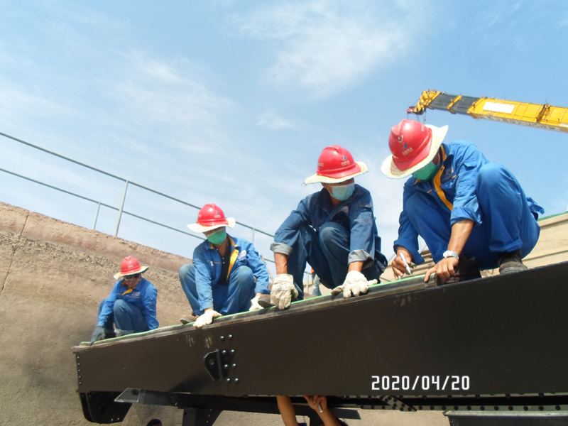 在沒(méi)有人手的時(shí)候,項(xiàng)目部打破工種限制,29個(gè)中方員工從上到下,披掛上陣。那些曾經(jīng)手握鋼筆、敲擊鍵盤的手,現(xiàn)在拿起了扳手、拉起了起吊葫蘆。大家不分部門,不分你我,相互配合,做好現(xiàn)場(chǎng)的施工工作。桁架上,項(xiàng)目經(jīng)理正在搖閘門手柄,技術(shù)人員在調(diào)整抱閘間隙;起重機(jī)旁,有人在搬枕木,墊支腿,穿繩掛鉤;另一個(gè)作業(yè)面上,有人頂著太陽(yáng)在打孔,焊接,打磨,拼裝。每個(gè)人的額頭上都堆滿了汗珠,汗水打濕了衣服,一天的工作下來(lái),衣服后背上都有一道道的汗?jié)n,一圈圈的汗花,卻沒(méi)有一個(gè)人叫苦叫累。