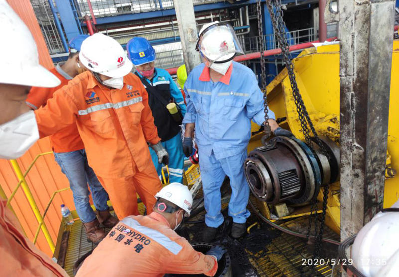 于是項(xiàng)目部立即組織人員現(xiàn)場檢查,并與設(shè)備廠家視頻在線診斷,最終確定為撈渣機(jī)驅(qū)動裝置的減速機(jī)故障??墒怯∧岙?dāng)?shù)貦z修人員又因節(jié)日休假,情急之下,項(xiàng)目當(dāng)即決定動用現(xiàn)場現(xiàn)有全部檢修力量,連夜拆解設(shè)備。那一晚,瓢潑大雨在炎熱的印尼像往日一樣如約而至,然而所有檢修人員卻毫不退縮,一頭扎進(jìn)雨幕中,熱火朝天干起來,汗水和著雨水從他們堅(jiān)毅的臉龐不斷流下,那專注的神情和堅(jiān)如磐石的背影讓人肅然起敬,夜幕下,他們工裝上中國水電的字樣份外醒目,最后連夜完成檢修工作,鍋爐撈渣機(jī)恢復(fù)正常運(yùn)營,印尼方為之動情而大贊盛贊,驚嘆著中國速度和中國力量!
